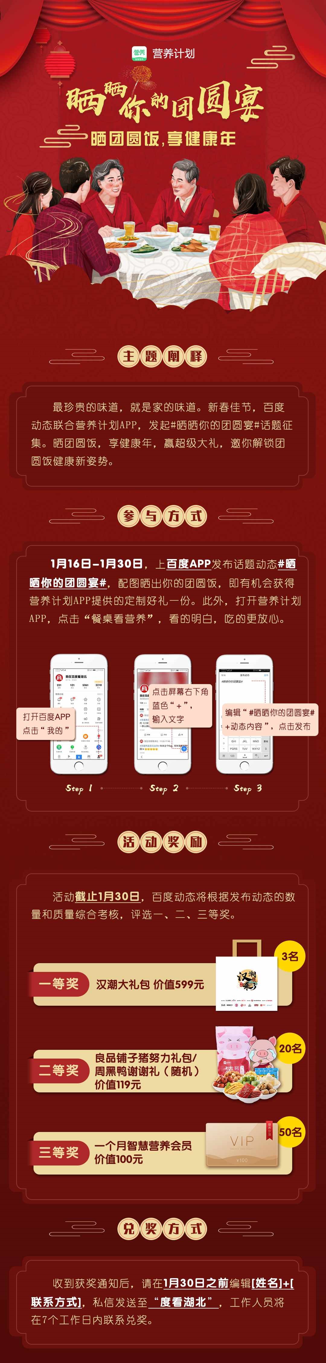 用户可在1月16日至1月30日,上百度App话题动态#晒晒你的团圆宴#,配图晒出团圆饭或者“餐桌看营养”评分截图,即有机会获得“营养计划App”提供的精美礼品。发布动态越多中奖概率越高,赶紧来参与吧!