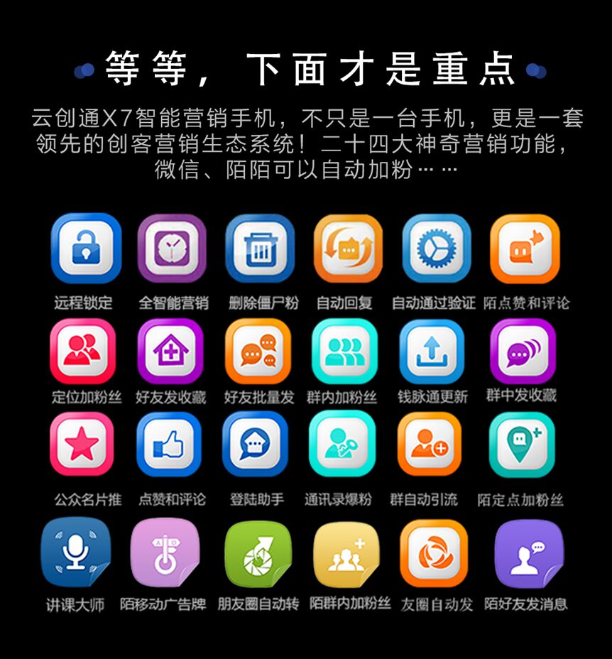 云创通科技本次推出的新品手机——X7创客智能营销手机,从硬件升级,提升使用体验。云创通X7创客智能营销手机,采用5.5英寸超薄原装魔丽屏搭配航空级全金属材质CNC一体机身,机身轻薄,轮廓线条流畅,贴合掌心,显示色彩饱满,画面清晰,质感细腻。在内置方面,采用MTK八核芯片和4GB超大运行内存+64GB超大存储内存配套,优秀内核和超大内存相结合,从硬件上改良手机运行,手机容量大,手机不拥挤,加载更快速。云创通X7创客智能营销手机,引进时新的前置指纹识别按键,解锁更方便,支付更安全。同时增加美霸功能,让爱分享的您使用更随心!