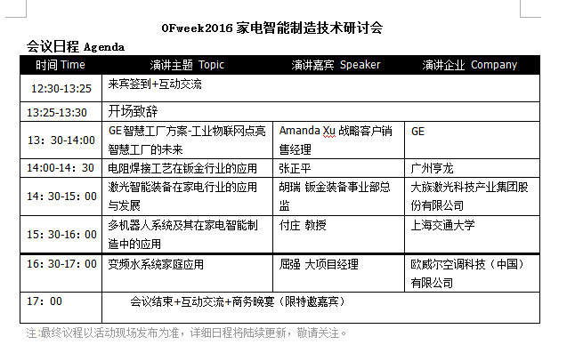 为了帮助家电产业人员更好了解未来家电制造的趋势,掌握未来智能制造的关键技术,OFweek工控网将于2016年5月在苏州推出一场《OFweek 2016家电智能制造技术研讨会》,会议将邀请来工业自动化、家电制造、钣金加工等领域的知名企业、专家教授及分析师等行业高端人士齐聚一堂,分析家电行业发展趋势,共同探讨家电数字制造、工业互联、信息化等先进制造技术,对未来家电智能制造如何更好发展给出更好的思路和建议。