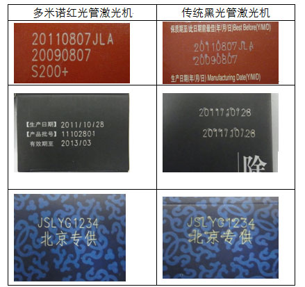 附多米诺红光管激光机与传统黑光管激光机在覆膜纸盒上的赋码效果对比