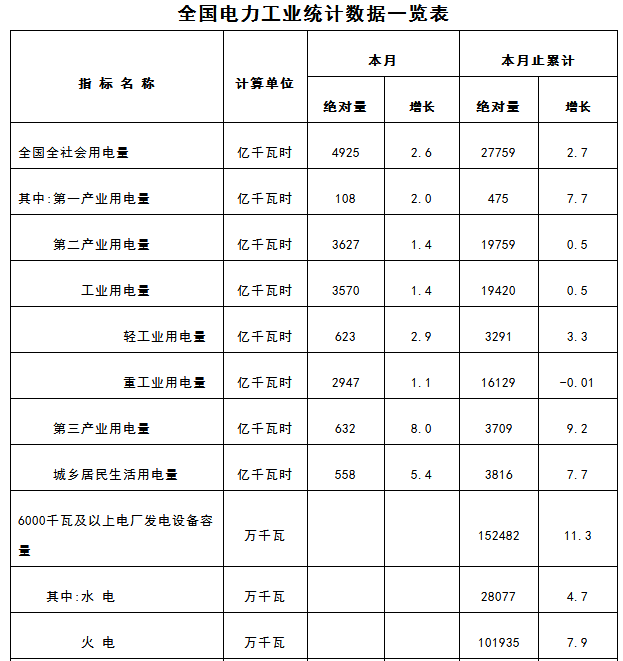 6月份,用电量4925亿千瓦时,同比增长2.6%。