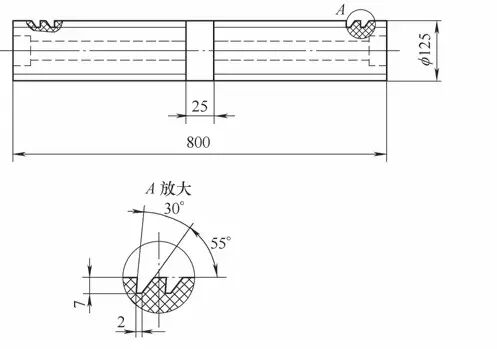(3)加工小螺距多头螺纹胶辊。该胶辊螺距为0.5mm,螺纹为三个头的60°三角螺纹,如图3所示。加工时,先在外圆磨上磨好外径,再在车床上分三次走刀将螺纹磨出。