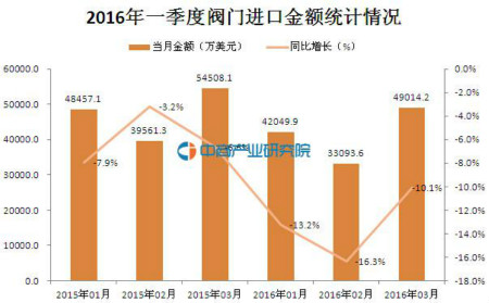 2016年3月我国阀门进口金额为49014.2万美元,同比下滑了10.1%。一季度3个月的进口金额全负增长。
