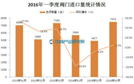 2016年3月中国阀门进口量为7454台,同比增长了2.3%。成为2016年一季度阀门进口量唯一正增长的月份。