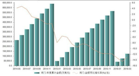 以下为2014年05月至2016年03月我国阀门进口年度累计金额及增长率统计:
