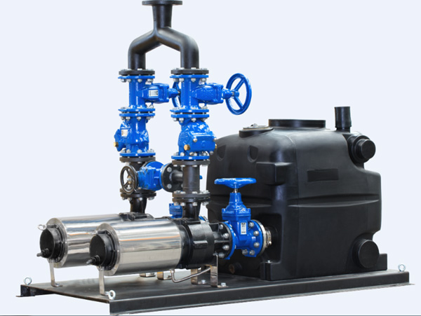 鉴于上述传统方式的缺点,集成化的污水提升器很好地解决了上述问题。该装置一般设置两台污水提升泵,一用一备,同时水箱中设置压力液位传感器,以监测水箱水位。生活污水经排水管进入密闭污水箱中,液位达到设定高度时由污水泵将污水排出车站,进入市政排污管道。