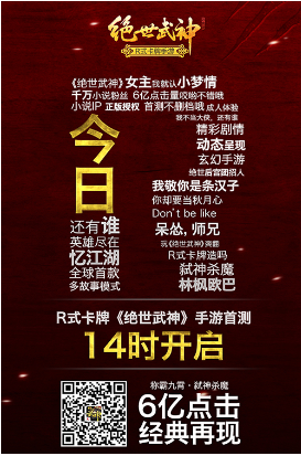 首款R式卡牌《绝世武神》手游今日14时正式开启安卓首测!此前《绝世武神》手游在各大媒体平台及官方渠道开放首测预约通道,短短一周时间便收到15万的预约信息,今日更已突破30万预约大关!而提起《绝世武神》主题曲MV,如今更是被广大网友争相模仿、翻唱的最火视频之一,MV主角则是以《明天不上班》一炮而红的嘻哈小天王谢帝,他创作的《绝世武神》主题曲也荣登2016年网络神曲排行榜第二!让我们通过这部《绝世武神》主题曲MV走近谢帝、走进这款备受瞩目的R式卡牌手游,带你穿越回到那个充满无限可能与惊奇的玄幻武侠时代!