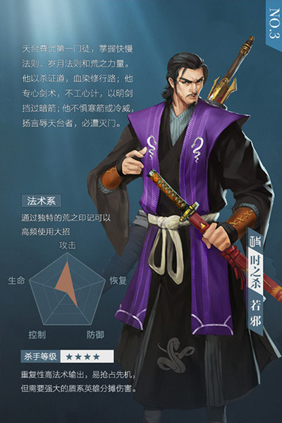 时之使者若邪,天台尊武第一门徒,掌握罕见的快慢法则、岁月法则和荒之力量。若邪的强大在于独特的时间控制技能,能够连续重复进行高强度的法力输出,但血量较薄, 折损度高,如浮光掠影,在悄无声息中拂去生命的痕迹。