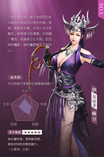 三生大帝之女,修三生经而分化出段欣叶及秋月心两大分身。作为原著中唯一的成名女帝,曦皇绝对拥有不可小觑的强大实力,曦皇的控制能力可算众多英雄中的翘楚之一,配合以高法伤和自愈能力,是不少战队的眼中钉,但毕竟是女帝,颐指气使间可挥斥方遒。