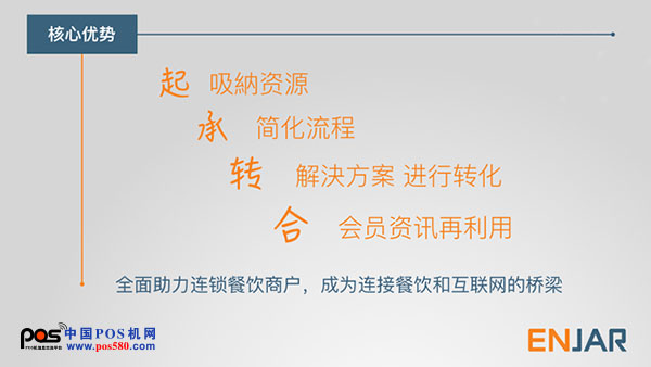 ENJAR为连锁餐饮商户搭建打造完整餐饮生态系统。满足餐饮企业管理和发展,承接互联网商业模式,帮助商户及时的洞察商业信息,从而实现产业资源调配四大大要素。ENJAR作为串联传统餐饮和互联网的桥梁,为企业提供实现这四大要素的核心支持力,以领先的信息技术帮助餐饮商行业商户逐步推进其转型进程。未来,由ENJAR创造的SAAS+O2O线上线下一体化的整合服务将满足客户差异化的转型需求,帮助客户实现更快的规模创新和连锁门店的拓展,以及更高效管理,创造新价值。