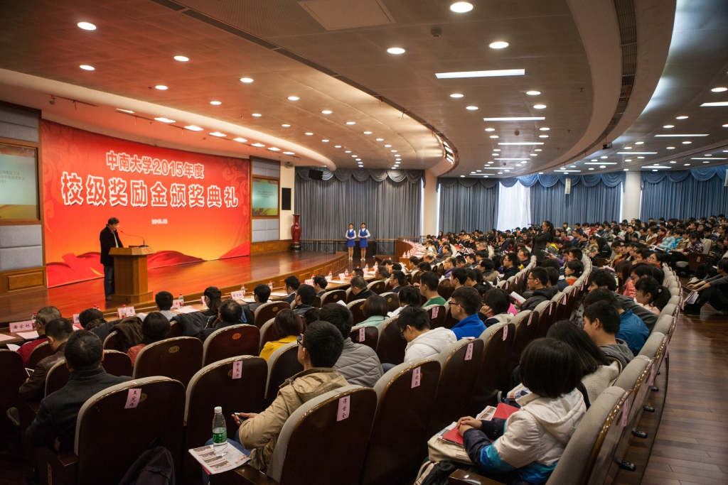 中南大学副校长胡岳华宣读《关于公布中南大学2015年度校级奖励金评选结果的通知》,常务副校长黄健柏致辞,山河智能党委书记、集团副总裁蔡光云为74名获得2015年度“山河英才”奖的学子颁奖。