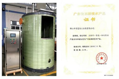 互联网+污水收集及输送一体化泵站产品和高新技术产品证书