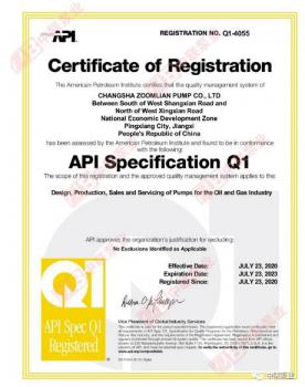 2020年7月23日,中联泵业顺利通过API Spec Q1质量管理体系认证审核,获得了API Q1证书。