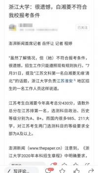 继清华北大之后,其他顶尖985名校也都陆续发布了声明。比如,浙大近日也表示:很遗憾,白湘菱不符合我校报考条件。