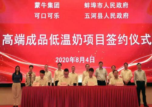 该条消息称:“我县依托畜牧业方面的基础、资源和区位优势,自2018年7月开始谋划该项目,经积极争取,多次互访、沟通洽谈,最终确定项目落户五河。该项目由可口可乐中国投资有限公司与内蒙古蒙牛乳业(集团)股份有限公司共同控股,在现代牧业(蚌埠)有限公司五河朱顶牧场投资全新的专业生产设备,进行高端成品低温奶生产销售。”