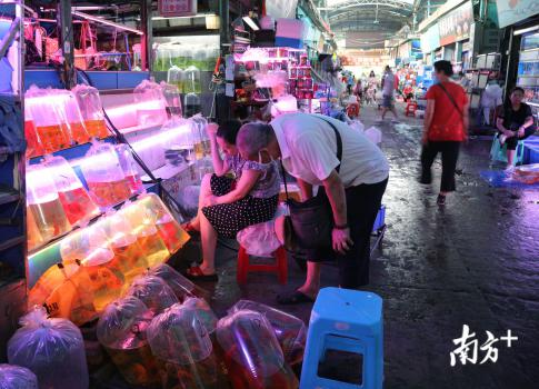 宋晓雨推着货车来到市场,将刚从鱼塘捆扎好的一包包锦鲤卸了货,去年,她在越和周边的鱼塘被拆了,只得把鱼儿们搬去西塱,如此一来每日不到5时就要起床。鱼塘拆迁时,宋晓雨隐约有种预感,如今,市场里档主们纷纷贴出“清货”字样,无人不知两个月后这里将全面清拆。
