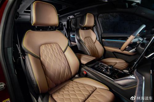座舱布局以中国古典建筑为灵感,大量使用横向条线,中控台由软质搪塑、黑色钢琴漆面板、金属拉丝面板和Ultrasuede超高档纤麂皮打造,四种材质结合得恰到好处,毫无违和感,让我直呼惊艳。最特别的是,龙爪之痕数字化面板和仪表两边采用了一体式龙爪灯光效果,加上31色交互式智能座舱氛围灯,光影变换,灵动无比,极富科技感。赤兔棕内饰配色来自源远流长的中华文化,取义“人中吕布、马中赤兔”。