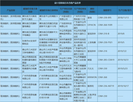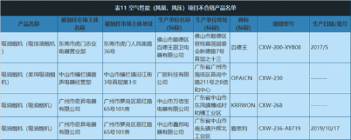本次抽查判定4款产品空气性能(风量、风压)项目不合格。该项目主要考核产品风量和风压的性能情况,该项目不合格时,直接影响吸油烟机的排烟效果,不能有效地排除油烟。东莞市虎门志业电器营业部销售、标称佛山市顺德区百德王厨卫电器有限公司生产的“百德王”;中山市横栏镇雅声电器经营部销售、标称广欧科技有限公司生产的“OPAICN”;广州市奇昇电器有限公司销售、标称中山市万信宝电器有限公司生产的“KRRWON”等。