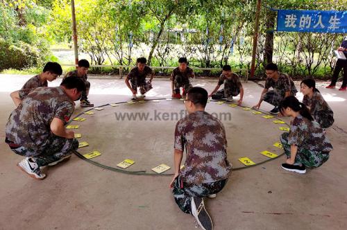 接着将20余名新员工随机分为两小队,分别取名“雄鹰队”和“狮王队”,并展示队名、队徽、队形和口号,初步建立团队意识,形成团队文化。