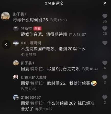 有网友提问 “国产 Model 3 标准续航版本何时能降入 25 万”,对此特斯拉表示 “静候佳音吧,值得期待哦”。