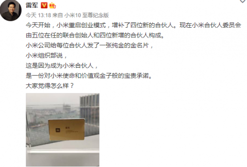 此次新增的合伙人包括王翔,周受资,张峰和卢伟冰。如今小米的“合伙人委员会”团队达到了9人,将会一起携手重启下一个十年的征程。此外雷军还为每一位合伙人发了一张纯金的金名片,因为成为小米合伙人,是一份对小米使命和价值观金子般的宝贵承诺。同时还启动了还启动了新十年创业者计划,正在选拔百位优秀人才,用创业心态和投入度奋斗!