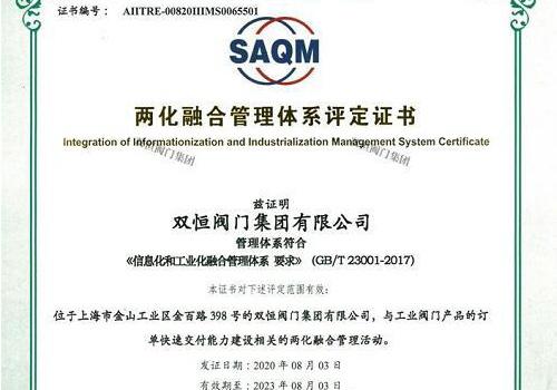 2020年08月03日,经过权威专家的指导和严格评审,双恒阀门集团顺利取得 “两化融合管理体系评定证书”,标志着集团在工业化与信息化融合迈上了新的台阶。