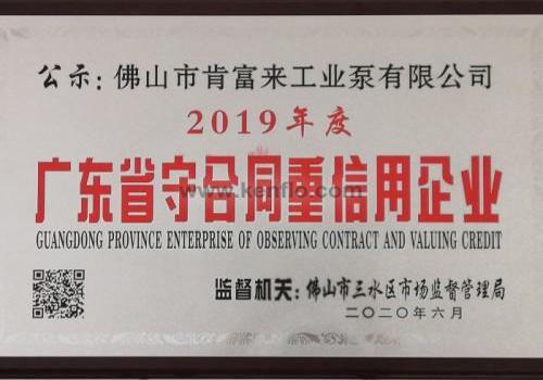 近日,佛山市肯富来工业泵有限公司凭借完善的诚信体系和诚信经营,首次申请并获评2019年度广东省“守合同重信用”企业。这是继肯富来总公司自2000年来持续多年被评为“广东省守合同重信用企业”后,佛山肯富来工业泵司首次获此荣誉称号。