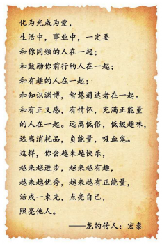 用愛之心,融之意,水之柔,海之纳,地之育,宇之容,遇方则方,遇圆则圆,随圆就方,你将无往而不利,能够与所有人打成一片,构建和谐,凝聚力量,创造奇迹。心存厚道,内心欢喜,你会发现原本枯燥无味的生活会变得充满韵味,欢笑,喜乐,心胸开阔,内心光明,你会发现以前纠结的琐碎小事已经成为激情,乐趣,所有的疲惫,哀愁,郁闷,荡然无存,生活从此有滋有味,生命原来是如此美妙。