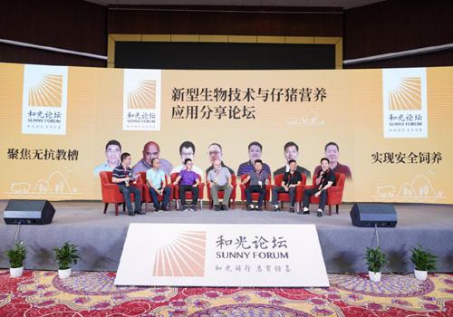 会议最后,主办方特设沙龙讨论环节,上海源耀农业股份有限公司特邀专家吴昌征博士客串论坛主持人,中国农业大学动物科学技术学院副院长王军军教授、巨星农牧股份有限公司猪营养总监刘宏伟博士、北京恩睿康农业技术咨询有限公司朱稳森博士、征泰集团副总裁、技术总监金伟博士、扬州立鼎系统工程有限公司总经理吴兵、微生物发酵专家、微生物工程师香红星作为论坛嘉宾以“新型生物技术与仔猪营养应用”为主题展开深入讨论,主要讨论了“生物饲料在当前行业背景下的意义及应用,在应用过程中易出现的主要问题及解决方法”、“无抗环境下,仔猪所面临的问题及解决方法”、“生物发酵全价饲料的可行性、发酵设备制造的未来趋势以及核心”、“肠道微生物组与仔猪健康的相关研究”等问题,在现场答疑环节,台上台下也有热情的互动。