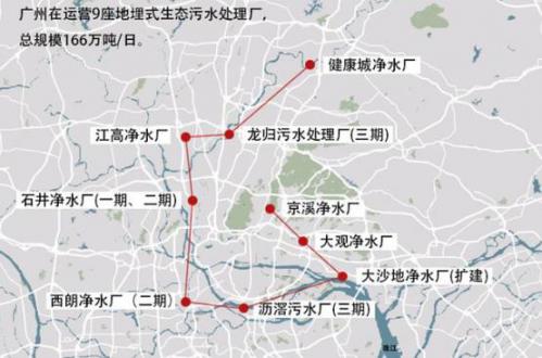 从2010年建成全国首座地埋式膜处理工艺净水厂——京溪地下净水厂、2018年初建成全市第二座采用地埋式构造的污水处理厂——石井净水厂(一期)到如今,广州累计建成地埋式污水处理厂9座,呈北斗状分布于珠江两岸,被誉为“地下北斗9星”。9座地埋式污水处理总产能181万吨/日,占广州中心城区污水处理总产能的三分之一强,占全国同类污水处理模式总产能规模的五成以上。广州也成为国内地埋式污水处理产能第一的城市。