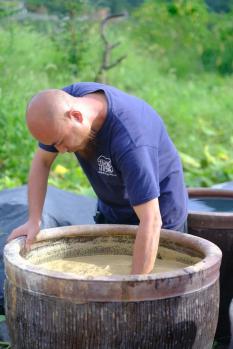 瓷器,源于泥土。坚持任何事情亲力亲为的章老师,从最初的挖泥土开始,就是自己亲自上阵。因为表层符合要求的泥土基本都已经挖掘光了,所以现在章老师都要掘地3、4米才能找到符合自己要求的泥土。而这样没有经过风化和日晒的泥土,成瓷之路才刚刚开始。它们需要经过一年的晾晒,再用水淘洗,浸泡,然后用水碓捶打成粉末状,最后在仓库屯3年才能成为制作瓯窑的合格原材料。