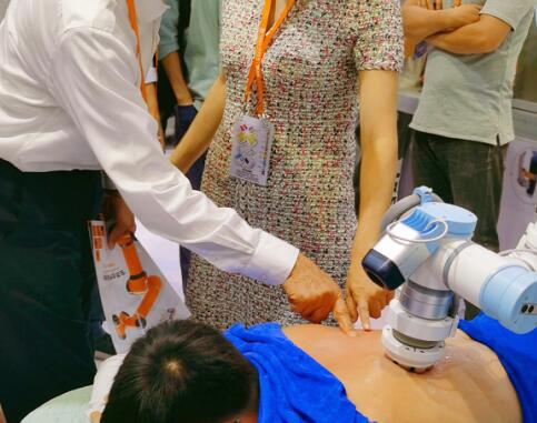 在本届展会上,秀域与遨博智能联合新品秀域超V热动力人工智能AR机器人亮相展会。在现场,秀域为展会来宾展示其真实操作场景,让来宾们亲身体验秀域超V热动力AR机器人智慧人体感知、6D机器手臂、远红外诊疗、靶向热疗等强大功能,这些功能将助力秀域实现客户私人健康方案,并根据方案完成健康调理。