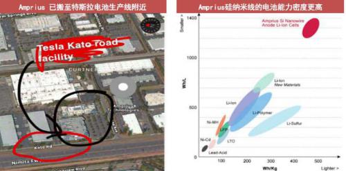从18650到21700,电池负极材料从石墨向硅碳转变,电芯能量密度提高约15%。特斯拉或将利用电池制造公司Amprius的硅纳米线材料,以提高电池电芯能量密度至400Wh/kg。