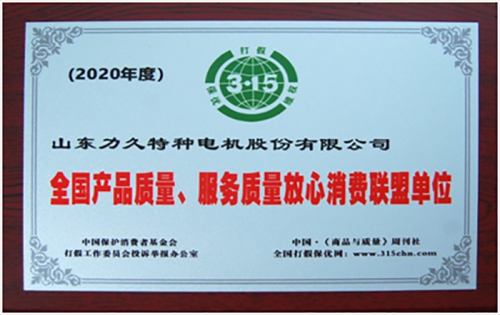 近日,山东力久特种电机股份有限公司被中国保护消费者基金会、中国《商品与质量》周刊社、全国打假保优网联合评为2020年度“全国产品质量、服务质量放心消费联盟单位”,正式成为315打假工作委员会认可的优质品牌。这是对公司长期以来践行质量第一、信誉第一、服务第一理念的充分肯定。