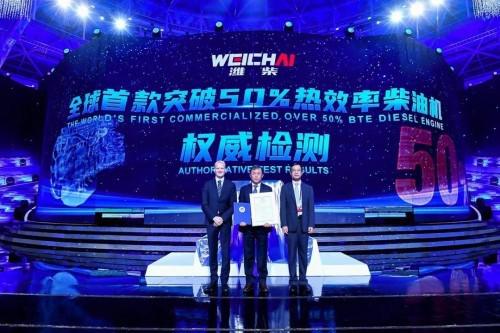 全球首款突破50%热效率柴油机产品发布会,中国内燃机国家检测机构中国汽车技术研究中心有限公司、国际权威内燃机检测机构德国T?V南德意志集团将认证证书颁发给潍柴,图片来源:潍柴资讯