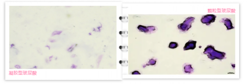 在电子显微镜下,凝胶型玻尿酸柔顺、平滑、均质,且不含颗粒;颗粒型玻尿酸呈颗粒状且不均匀。如下图: