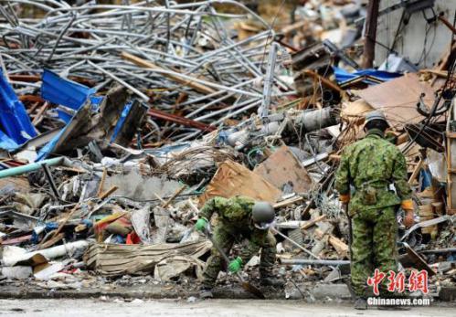 资料图:2011年4月,救援人员在日本宫城县女川町的地震海啸灾区清理废墟。中新社发 侯宇 摄