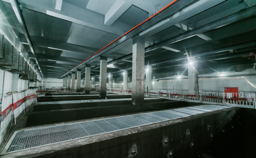 项目采用全地下式施工,基坑深达17.4米,为保持良好的运营环境,降低污水处理过程中臭气的浓度,项目团队在箱体内分别设置独立的机械排风及机械送风或防火百叶进风系统,送风量为排风量的80%,以确保工艺处理车间及管廊区域内的空间处于微负压状态,防止臭气外溢,箱体内的臭气经生物除臭及离子除臭双重系统处理后,再经由通风塔高空排放,空气中闻不到一丝臭味。