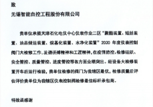日前,无锡智能自控工程股份有限公司收到了中石化天津公司电仪中心仪表作业二区的感谢信,感谢信中说,无锡智能自控工程股份有限公司在承揽的天津石化电仪中心作业二区“聚酯装置、短丝装置、油品储运装置、烷基化装置、水净化装置”2020年度仪表控制阀门大修工作中,发扬拼搏精神和工匠精神,在疫情防控、检修组织、安全管控、进度管控等各方面业绩突出。经设备大检修装置开车后进行检验,无锡智能自控工程股份有限公司检修的阀门为中石化天津公司辖区最优,故被中石化天津公司授予“仪表控制阀检修最佳标杆承包商”称号。