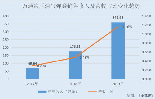 具体来看,2017-2019年,万通液压油气弹簧的销售收入分别为69.64万元、176.15万元、359.93万元,占主营业务收入的0.29%、0.48%、1.16%;2018-2019年,万通液压油气弹簧的销售收入同比增加152.94%、104.33%。