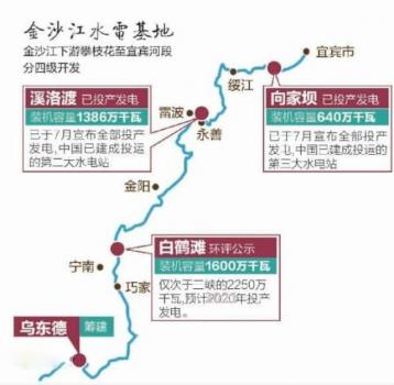 金沙江流域面积47.32万平方公里,约占长江流域面积26%。从长江源头至宜宾干流河长3364公里,落差5100米,分别占长江干流全长和总落差的55%和95%。金沙江坡陡水流急,水量丰沛且稳定,落差大且集中。金沙江拥有丰富的水能资源,其蕴藏量达1.124亿千瓦,约占全国的16.7%,可开发水能资源达9000万千瓦,其水能资源的富集程度堪称世界之最。金沙江下游河段:下段是云南、四川两省的界河,规划4级,总装机4000 多万千瓦,平均每级装机达1000万千瓦。规划有溪洛渡、向家坝、乌东德和白鹤滩四座梯级水电站,总装机规模相当于“两个三峡”。金沙江下游河段从上至下依次为乌东德、白鹤滩、溪洛渡、向家坝四座水电站,其中溪洛渡与向家坝水电站、白鹤滩与乌东德水电站各构成“一组电源”,主要向华中、华东和华南地区送电。