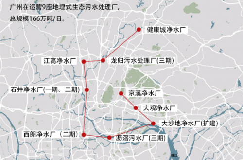 △广州建成地埋式污水处理厂9座,总产能181万吨日,呈北斗状分布于珠江两岸,被誉为“地下北斗9星”(央广网发 广州市水务局供图)