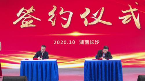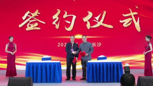 双峰县人民政府与湖南省餐饮协会签订协议(左:中共双峰县委副书记、县长 ?彭石清 右: 湖南省餐饮行业协会副会长、湘菜产业供应链委员会主席 黄惠明 )