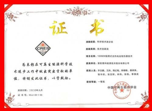 近日,首航高科能源技术股份有限公司100MW级熔盐塔式光热电站吸热器技术在2020年度中国可再生能源学会科学技术奖评审会上荣获“科学技术进步奖”技术创新类一等奖。这是首航高科首次获得光热发电领域重量级技术与学术奖项,标志着首航高科相关技术成果进入收获阶段,对企业构筑技术壁垒、锻造核心竞争力意义深远。