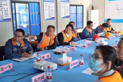 媒体一行在项目部办公室观看宣传片,听取项目工程概况。