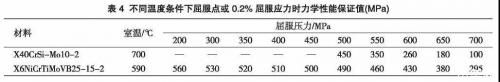 表4为X40CrSiMol0-2和X6NiCrTiMoVB25-15-2在不同温度条件下屈服点或0.2%屈服应力时的力学性能保证值,通过观察表4可以看到X40CrSiMol0-2在室温下屈服强度或0.2%屈服应力为700MPa,在700℃时衰减为100MPa,衰减比较明显;