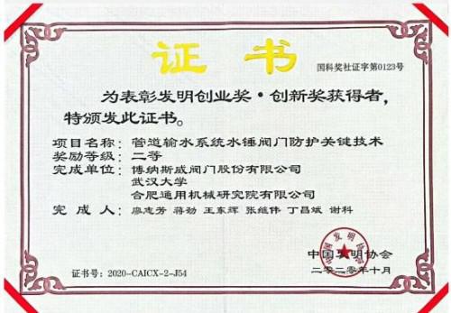 2020年11月21日,博纳斯威与武汉大学、合肥通用机械研究院有限公司联合完成的《管道输水系统水锤阀门防护关键技术》?获得2020年度中国发明协会—发明创新奖二等奖。