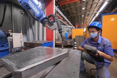 ▲哈电电机成功应用机器人焊接技术解决轴瓦巴氏合金堆焊等难题
