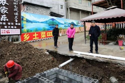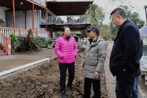 宋莉(中)现场查看截污干管建设和沿线商户原有设施恢复情况