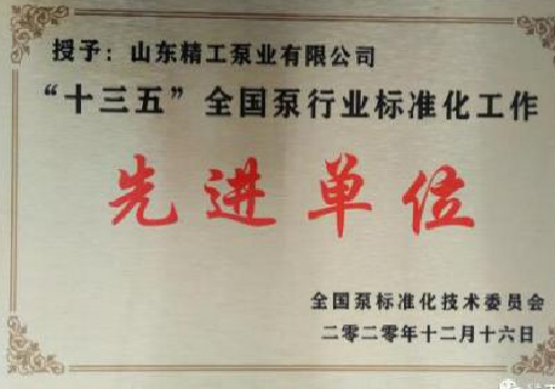山东精工泵业积极参与国家或行业标准的制定工作,先后主持制定国家标准一项,参与修制定国家/行业标准八项,曾被全国泵标准化技术委员会评为“十二五”全国泵行业标准化工作先进单位。